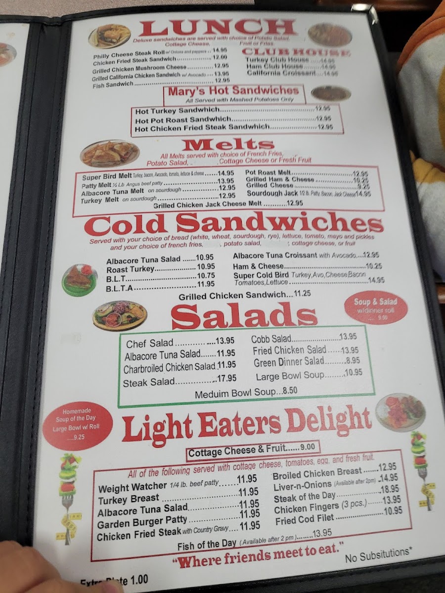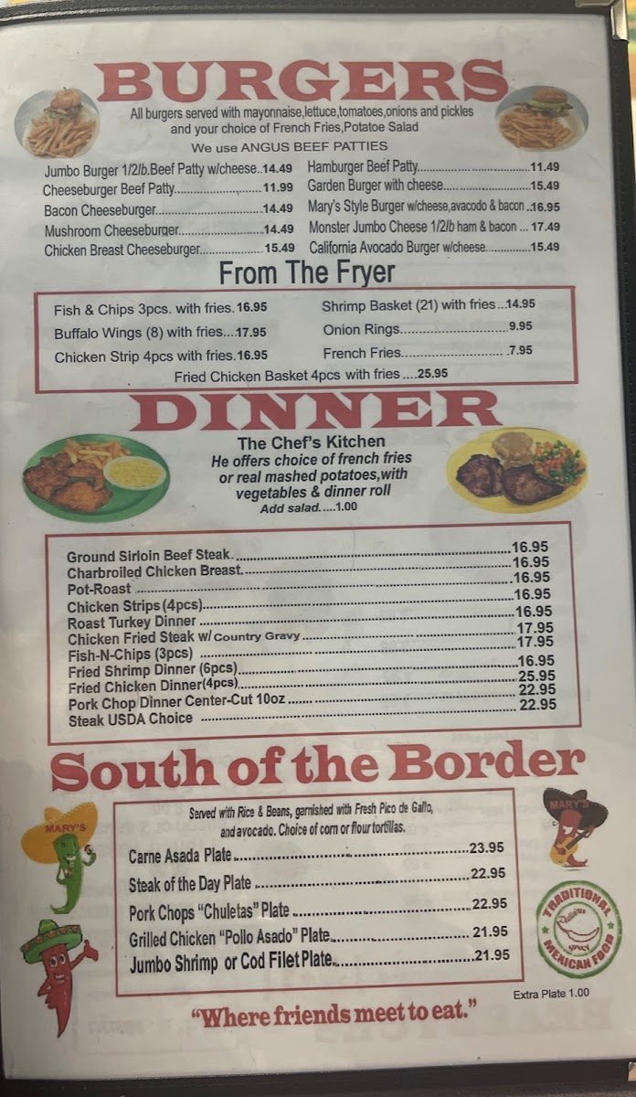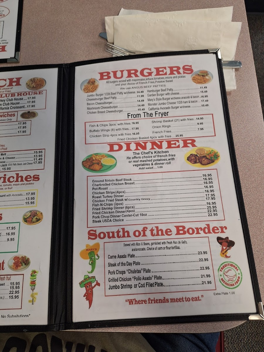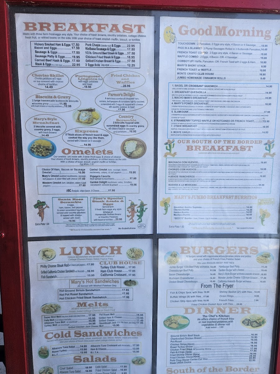 The menu at Mary's Family Restaurant features a variety of American-style dishes, with a strong emphasis on breakfast and casual dining options. Visitors can choose from a diverse selection organized into several key categories including breakfast specialties, burgers, dinner entrees, and kids’ offerings.