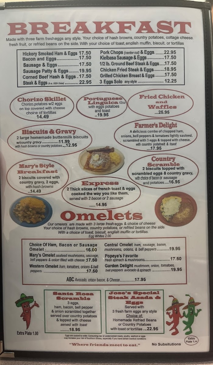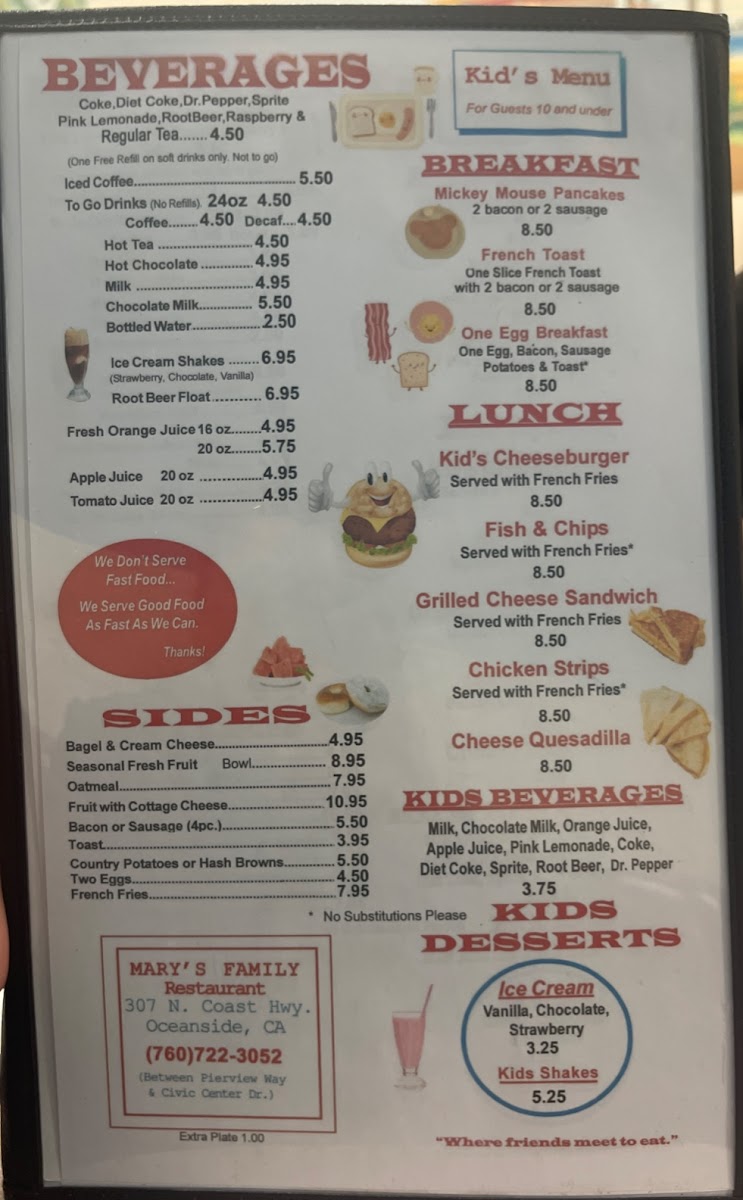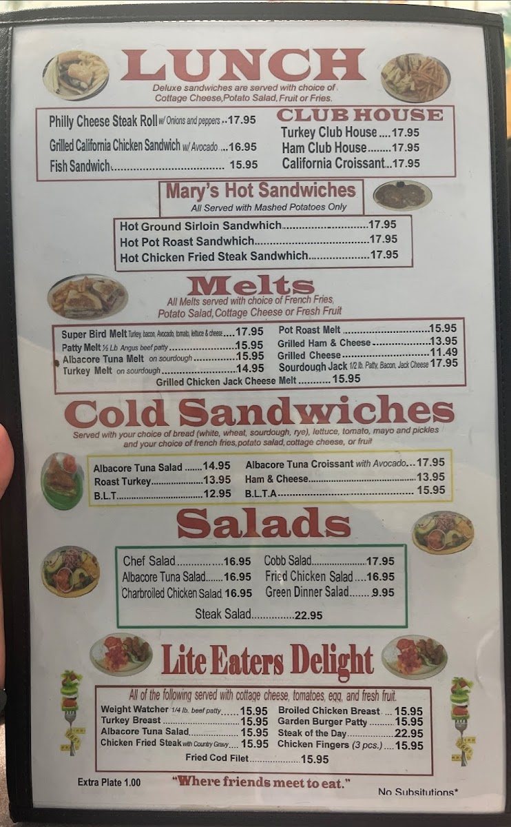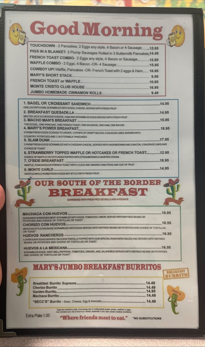 The menu at Mary's Family Restaurant features a variety of American-style dishes, with a strong emphasis on breakfast and casual dining options. Visitors can choose from a diverse selection organized into several key categories including breakfast specialties, burgers, dinner entrees, and kids’ offerings.